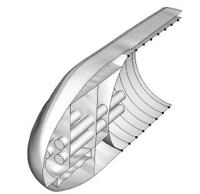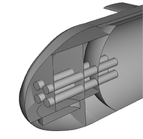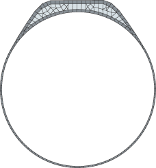 Reduced modelSince the Kwon & Fox (KF) load signal carries a large excitation spectrum, the outside water has to extend to a large distance, corresponding to the lowest end of spectrum, and both the submarine structure and the outside water have to be discretized with a small element size, corresponding to the wavelength of the high end of the spectrum. This generates a considerably large computational model, due also to the significant difference between the length of the submarine model (62 m) and the low wavelength of the high end of the spectrum. Consequently, a modeling approach is employed in this example problem where a “region of interest” is defined around the shock-wave standoff point. The reduced model still includes details such as flooded bow compartments, torpedo tubes, a sonar dome, and a portion of the pressure and exterior hulls, with the fluid domain defined in the intra-hull space. In addition, stiffeners are added for the detailed region of the pressure hull. The rest of the submarine model is simplified using beam elements, coupled with the region of interest using kinematic coupling constraints. The section behavior of the beams is defined using meshed cross-sections to approximate the cross-section inertia of the real structure (Figure 6, Figure 7, and Figure 8). The tapered region at the back of the submarine is approximated via 13 stepwise-constant circular cross-sections. Finally, the inertia effects of the outside water are included. The exterior acoustic domain (water) envelops only the region of interest and extends to a distance of approximately 1.5 m from the submarine structure, corresponding to half the wavelength inwater at a frequency of 500 Hz. Impedance boundary conditions are applied on truncation surfaces to reduce spurious reflections.